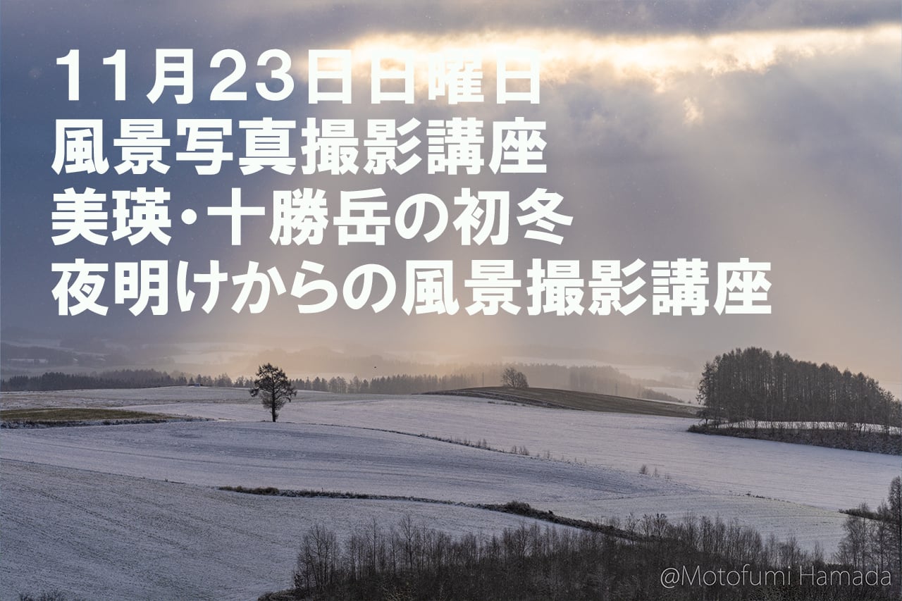 風景写真で有名な美瑛、十勝岳で夜明けから初冬の風景写真を撮る講座です。実際の撮影を通して風景写真の撮り方の基本を学びながら撮影を楽しみましょう。撮影ルートは当日の気候条件を考慮して当日決めます。