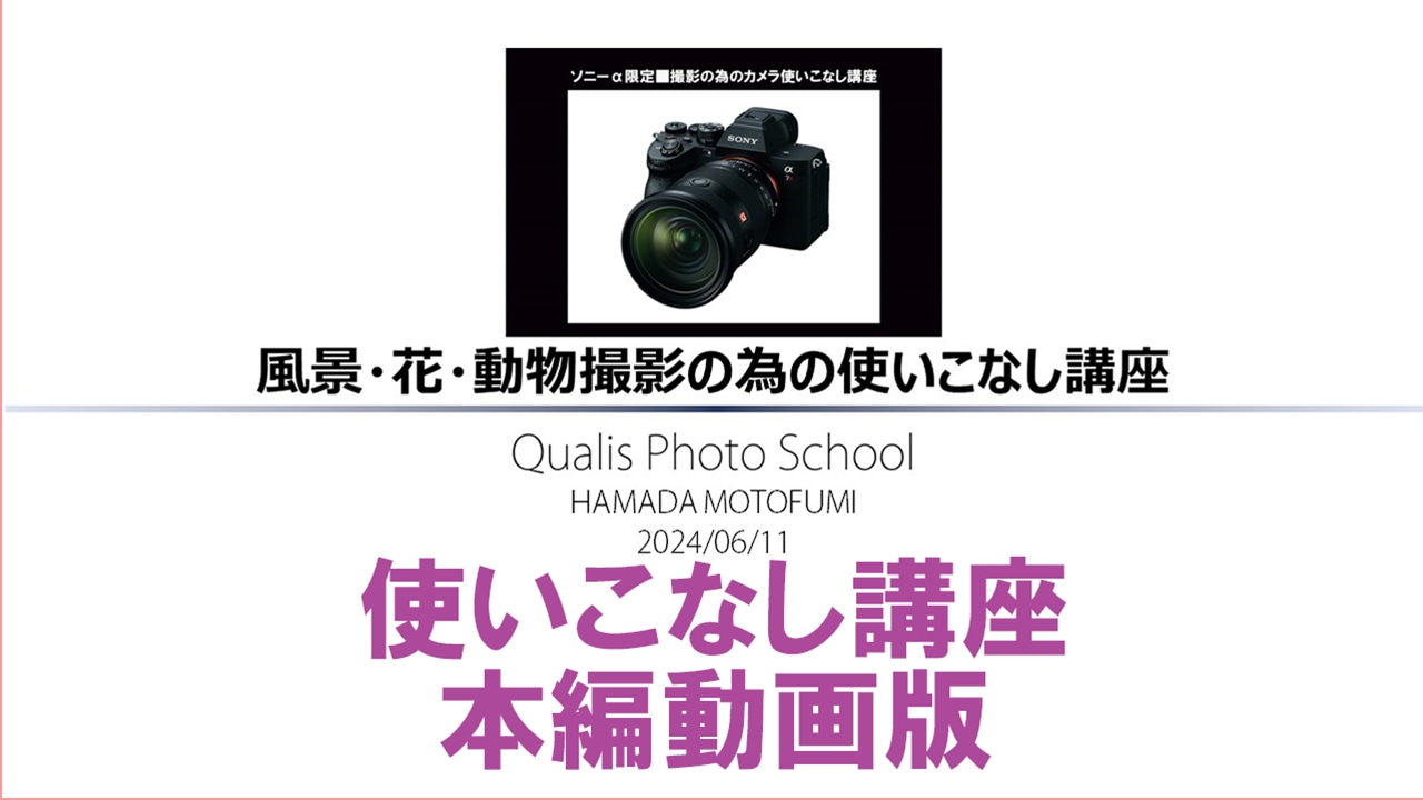この資料は別途リアル開催でご案内している「ソニーα使いこなし講座」の動画配信版になります。ご購入後You-Tubeの限定配信動画のURLをメールでご案内いたします。(本動画は約120分です。)
